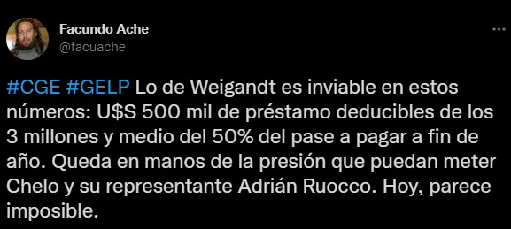 El futbolista involucrado en esta negociación es Marcelo Weigandt. Según la información del periodista Facundo Aché, el que consultó condiciones fue Gimnasia de La Plata. Aunque ante el llamado de los dirigentes platenses a Juan Román Riquelme, Boca marcó su postura clara: un préstamo hasta fin de año con una obligación de compra cercana a los 3 millones de dólares.