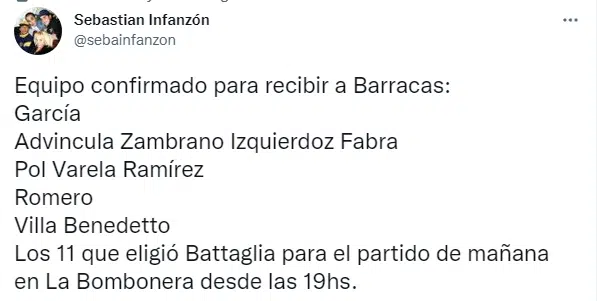 Si bien no está confirmado todo indica que Javier García; Luis Advíncula, Carlos Zambrano, Carlos Izquierdoz, Frank Fabra; Alan Varela, Pol Fernández, Juan Ramírez; Óscar Romero, Sebastián Villa y Darío Benedetto van a ser los once jugadores que salten al campo de juego de La Bombonera, en busca de tres puntos más que importantes.