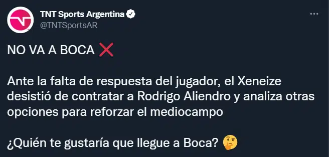 Ante la falta de respuesta, el Xeneize habría desistido de contratar a Rodrigo Aliendro. Hace algunos días, Boca había hecho una oferta formal por el mediocampista, que también negocia con Independiente y que todavía no decidió su futuro profesional. El volante finaliza siendo agente libre a fin de mes, cuando finalice su vínculo con Colón.