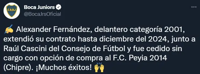 El club de la Ribera anunció la salida de otro jugador. “Alexander Fernández, delantero categoría 2001, extendió su contrato hasta diciembre del 2024, junto a Raúl Cascini del Consejo de Fútbol y fue cedido sin cargo con opción de compra al F.C. Peyia 2014 (Chipre). ¡Muchos éxitos!”, publicó Boca en su cuenta oficial de Twitter.