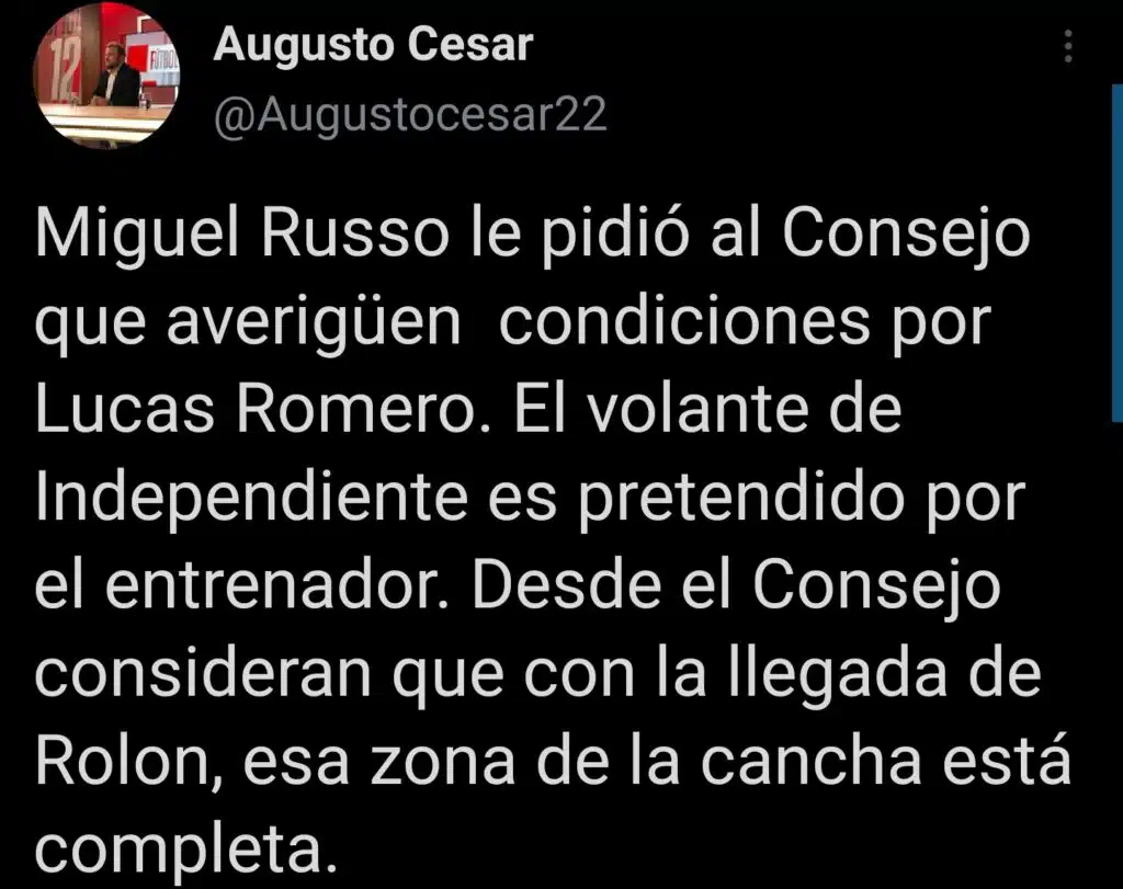 Según dejó saber Augusto César, periodista de la cadena ESPN, el entrenador de Boca pidió preguntar condiciones por Lucas Romero, volante central de Independiente de Avellaneda. El futbolista ya fue deseo del DT hace unos meses atrás, sin embargo, el Consejo de Fútbol prefirió incorporar al jugador de Huracán, Esteban Rolón. Con la salida de Campuzano, se abriría un lugar para Romero.