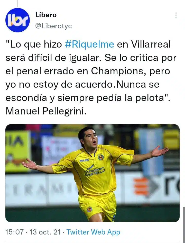 El extécnico de River Plate, Manuel Pellegrini, dialogó ayer con el programa Líbero emitido por TyC Sports. En ese sentido, el actual entrenador del Betis señaló: “Lo que hizo Riquelme en Villarreal será difícil de igualar. Se lo critica por el penal errado en Champions, pero yo no estoy de acuerdo”. El chileno fue entrenador del club español cuando el ídolo xeneize fue a jugar allí.