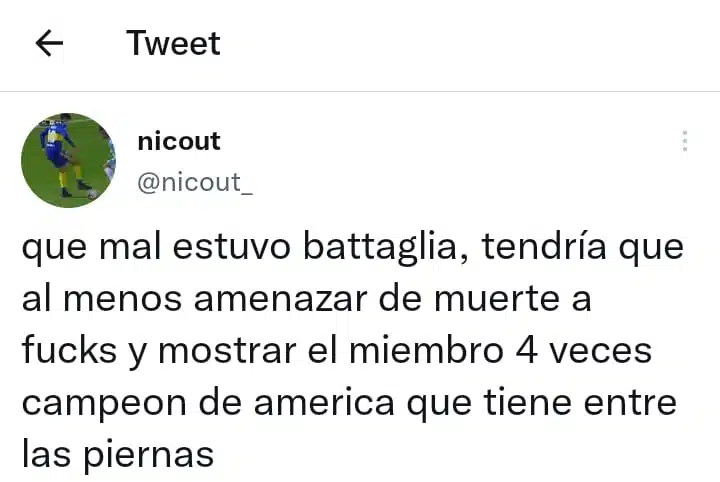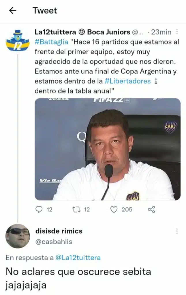 En la jornada de hoy, el técnico de Boca Sebastián Battaglia, brindó una pequeña conferencia de prensa. En ese sentido, expresó: “Estoy agradecido, al día de hoy estamos en una final de Copa Argentina y dentro de la Copa Libertadores en la tabla anual, quedan partidos por jugar, los objetivos se van cumpliendo y todos buscamos lo mejor para Boca”. Sin embargo, algunos hinchas le respondieron en las redes: “No aclares que oscurece Sebita”.