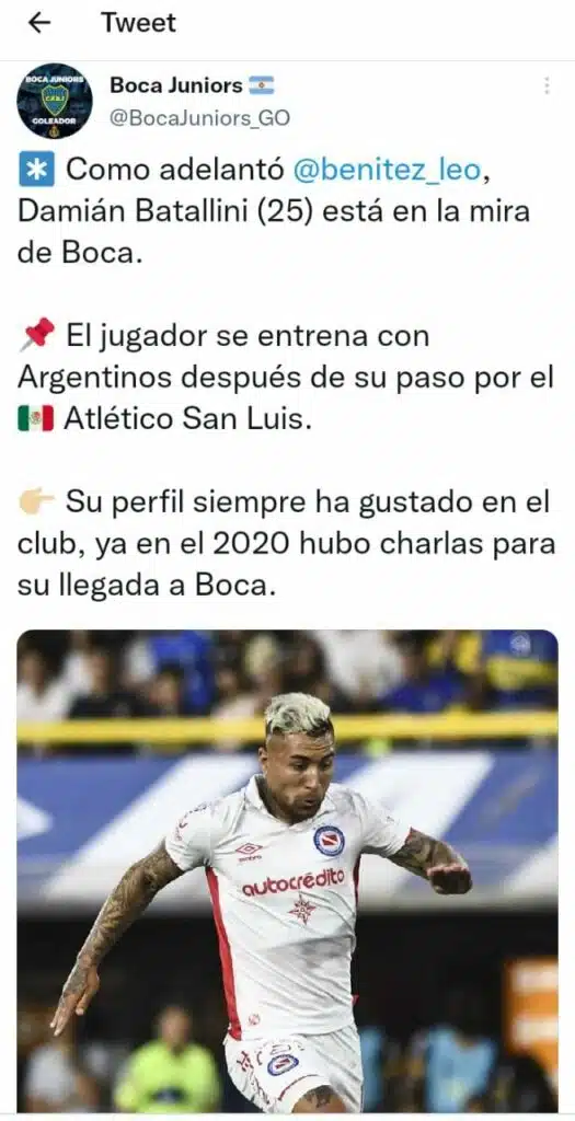 Tiempo atrás, Boca se interesó en uno de los mejores jugadores del torneo local. Se trató de Damián Batallini, que en ese entonces jugaba en Argentinos Juniors. No obstante, el volante decidió marcharse a México, a pesar del interés de Juan Román Riquelme. Ahora, la información es la siguiente: “Batallini está en la mira de Boca. Su perfil ha gustado siempre en el club”.