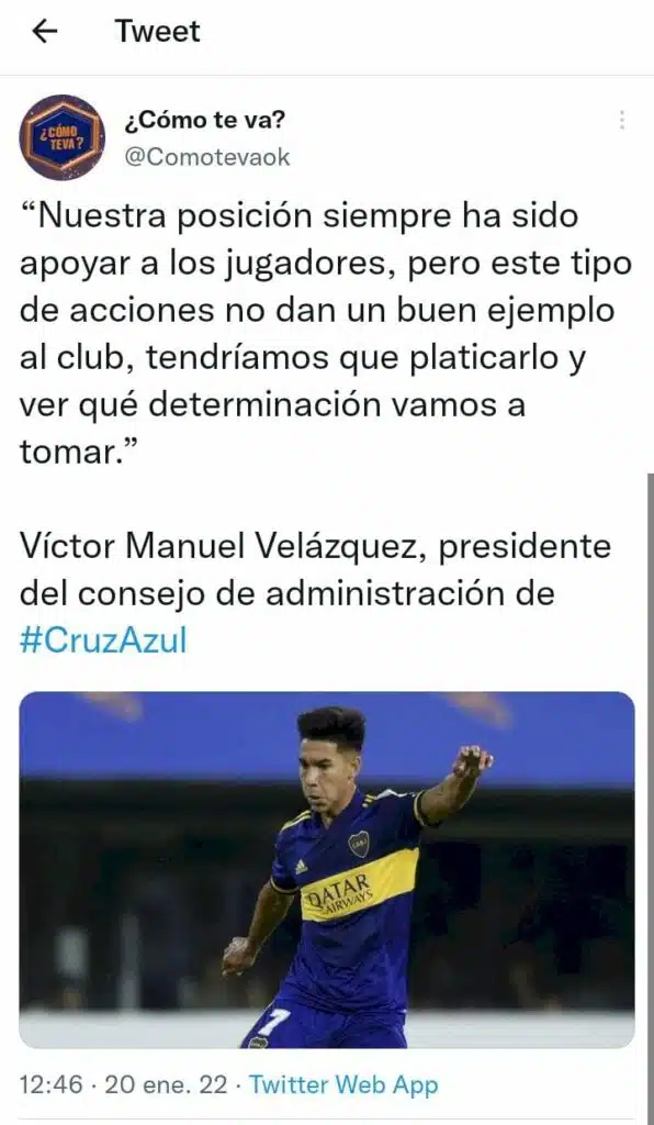 Estas fueron palabras de Víctor Manuel Velázquez, presidente del consejo de administración del equipo mexicano. Dialogó con el programa ¿Cómo te va? de Radio Colonia. Además agregó: “Esperamos a Pol y queremos dialogar con él para ver sus pretensiones. No recibimos llamados oficiales de Boca. En caso de que Pol salga sería por una venta, no tendría lugar el préstamo”.