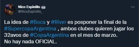 Si bien no hay no hay ningún pedido confirmado, la disputa del torneo local, sumada al desgaste posterior de la fase de grupos de la Copa Libertadores 2022 y los partidos de 32avos de Copa Argentina fijados para marzo que tienen ambos clubes, son motivo suficientes para que desde AFA se replanten cual puede ser el momento oportuno.