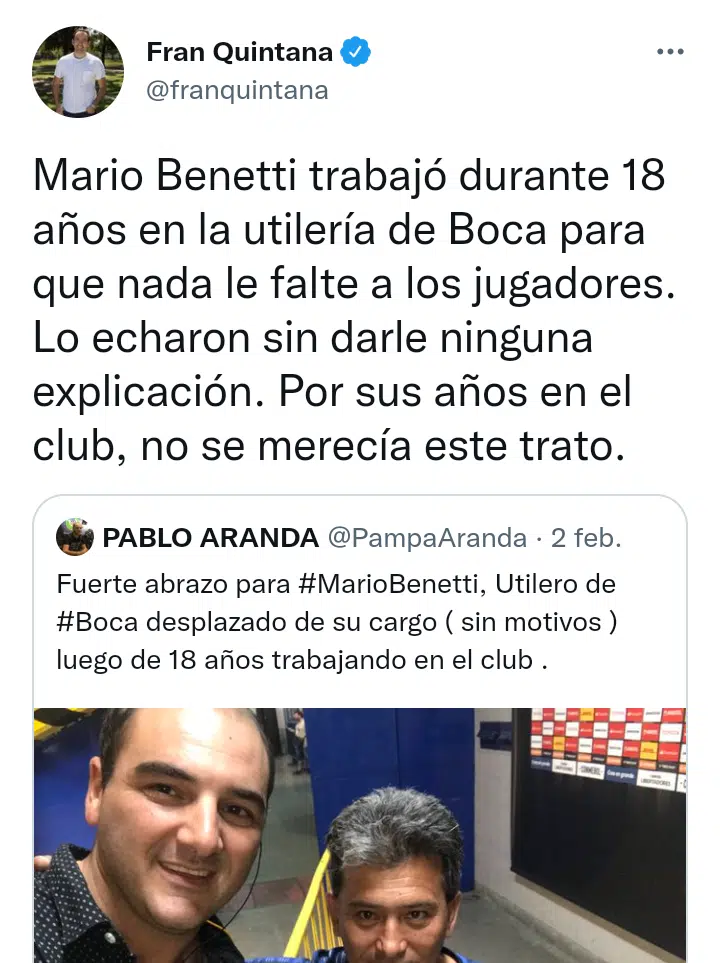 Quintana “denunció” por redes el despido el despido injusto a un empelado: “Mario Benetti trabajó durante 18 años en la utilería de Boca para que nada le falte a los jugadores”. Comenzaba siendo bastante fuerte el ex dirigente y directamente hacia las personas que manejan hoy al club. Un mensaje con mucho enojo pero apoyando también al trabajador.