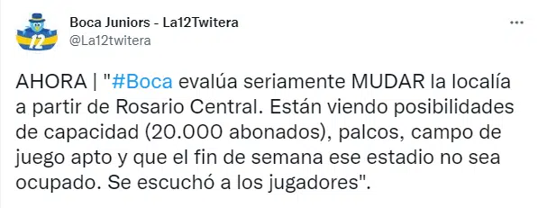 Horas después del encuentro, el periodista Diego Monroig, informó una noticia que el hincha no se esperaba: “Boca evalúa seriamente MUDAR la localía a partir de Rosario Central. Están viendo posibilidades de capacidad (20.000 abonados), palcos, campo de juego apto y que el fin de semana ese estadio no sea ocupado. Se escuchó a los jugadores“.