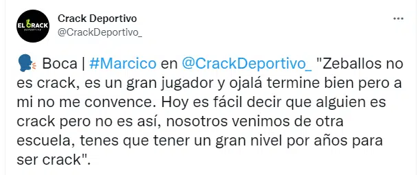“Zeballos no es crack, es un gran jugador y ojalá termine bien pero a mi no me convence. Hoy es fácil decir que alguien es crack pero no es así, nosotros venimos de otra escuela, tenes que tener un gran nivel por años para ser crack“, comentó Márcico en diálogo con Crack Deportivo. Una respuesta que sorprendió a todos los hinchas.