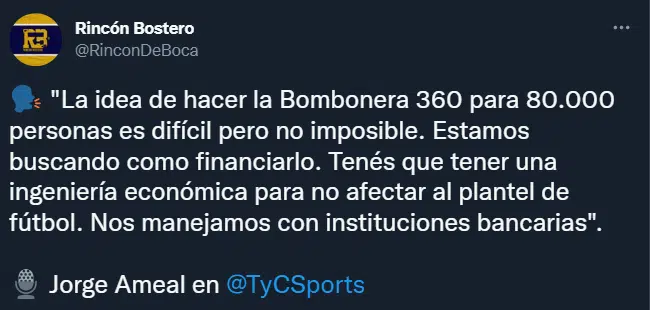 Al máximo mandatario del club de la Ribera le preguntaron por su proyecto y entró en detalles. “La idea de hacer la Bombonera 360° para 80.000 personas es difícil, pero no imposible. Estamos buscando cómo financiarlo. Tenés que tener una ingeniería económica para no afectar al plantel de fútbol. Nos manejamos con instituciones bancarias”, expresó Ameal.