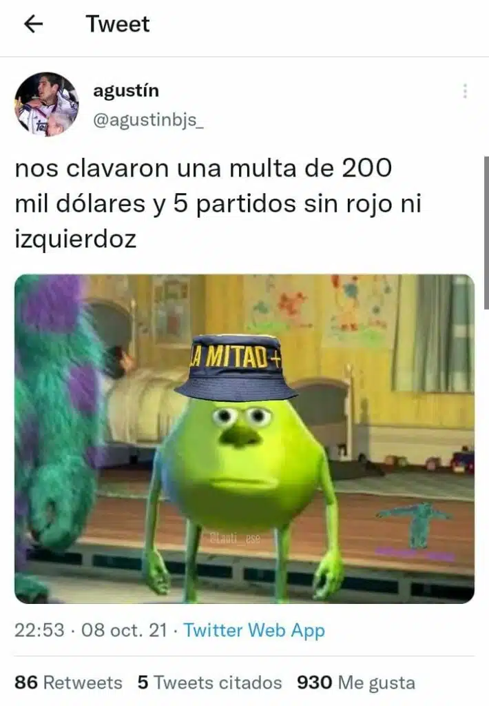 Si bien en la semana se habían filtrado las supuestas sanciones, anoche fueron efectivas a través de un comunicado. Los memes no tardaron en llegar, especialmente para los protagonistas: Marcos Rojo, Carlos Izquierdoz, Sebastián Villa, Cristian Pavón y Javier García. Esos jugadores se perderán varios partidos del certamen 2022, si es que el xeneize clasifica.