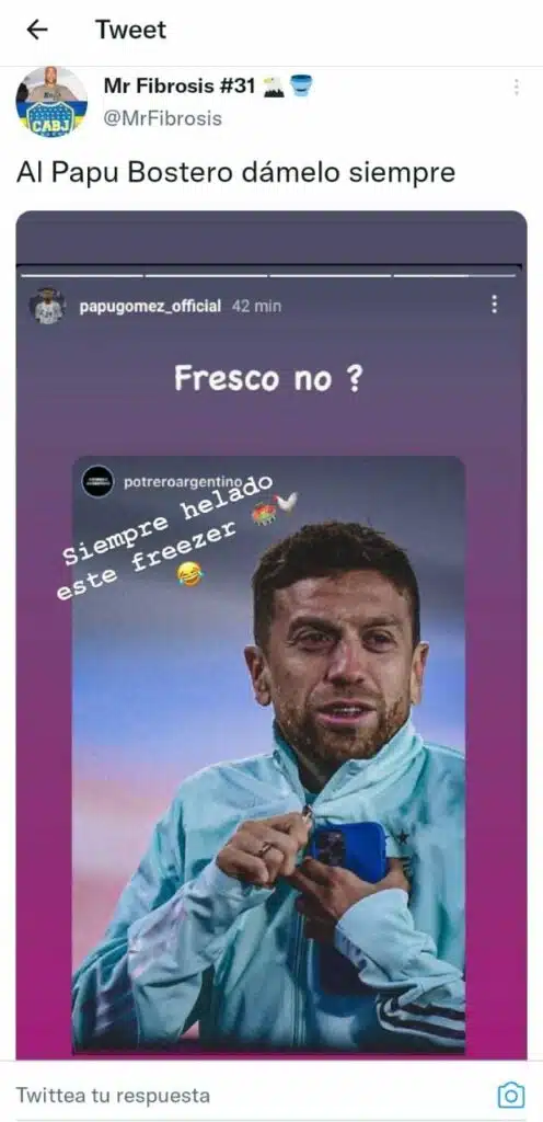 El jugador de la selección argentina, Alejandro “Papu” Gómez, habría publicado una historia en instagram que hizo ruido en Boca Juniors. Según reflejaron las redes sociales, el volante del Sevilla salió en una foto tomada en el Monumental el otro día ante Perú con un textual: “¿Fresco no?, Siempre helado este freezer” haciendo referencia al estadio de River Plate. En las redes se hizo viral: “Al Papu Gómez bostero dámelo siempre”.