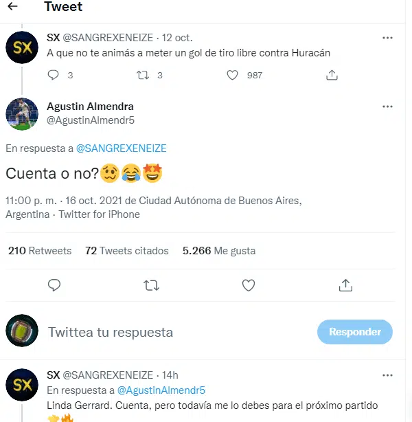 Pero lo viral llegó una hora después del partido, cuando el volante agarró su celular y le habló a la famosa página de Twitter “Sangre Xeneize”: “Cuenta o no”, le puso Almendra en un tuit más abajo, en relación al golazo que había convertido hace un rato, más allá de que no fue de tiro libre.
