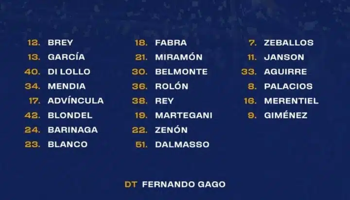 Fernando Gago convocó a 22 jugadores para disputar el encuentro en San Nicolás donde resalta el regreso de Lucas Blondel que vuelve a estar a disposición tras recuperarse de su lesión en los ligamentos que lo tenía marginado desde marzo de 2024. El regreso de Esteban Rolón después de su año a préstamo por Belgrano de Córdoba, también de los nuevos refuerzos como Carlos Palacios que usará la 8.