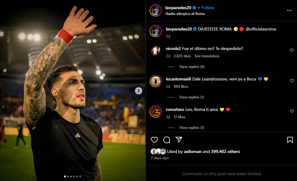 En la publicación, el jugador escribió: “Dajeeeeee Roma“. Sin embargo, algunos fanáticos del cuadro de La Ribera leyeron otra cosa, además de llegar a malinterpretar las fotos que eligió el ex mediocampista del PSG. “Nos re ilusionó“, “Leí DEJÉ ROMA“, y “Leí lo mismo“, fueron algunos de los comentarios más destacados, que llegaron rápidamente a las respuestas en la cuenta de Instagram de Paredes.