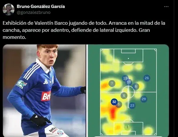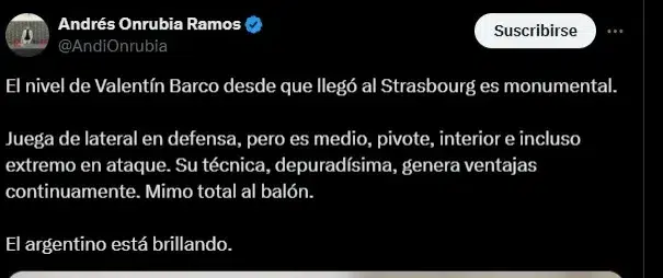 Este fin de semana, el Racing de Estrasburgo volvió a ganar en la Ligue 1, y Barco fue figura indiscutible del encuentro ante el Reims. Ahora, jugando como volante ofensivo, no solo recibe elogios de su DT y sus compañeros, sino que seguidores del fútbol francés en general cayeron rendidos al juego del ex Boca: “El nivel de Valentín Barco es monumental“.