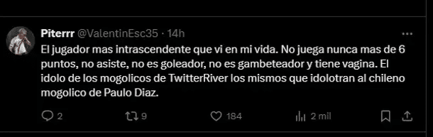 “El jugador más intrascendente que vi en mi vida. No juega nunca más de 6 puntos“, “Cada vez que la agarra siento que puede pasar algo y termino con bronca“, “En junio hay que venderlo“, y “La camiseta de River le quedó gigante“, fueron algunos de los mensajes más destacados en X (Twitter), disparando munición gruesa contra el ex Boca.
