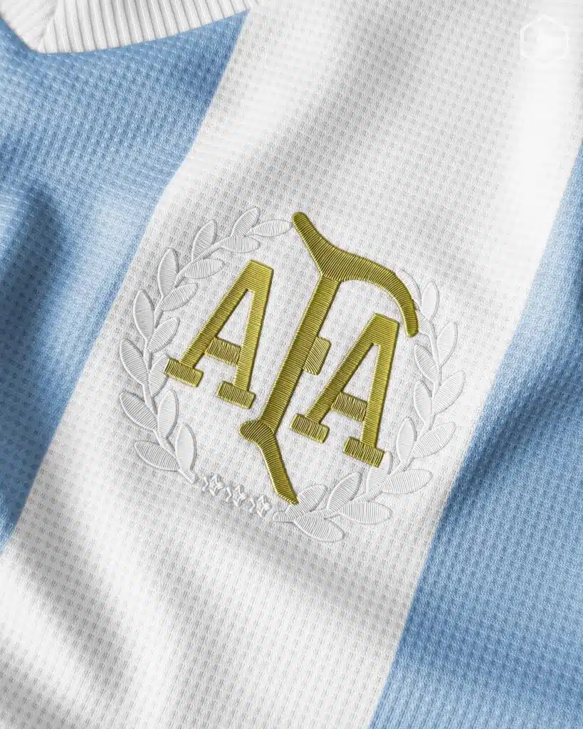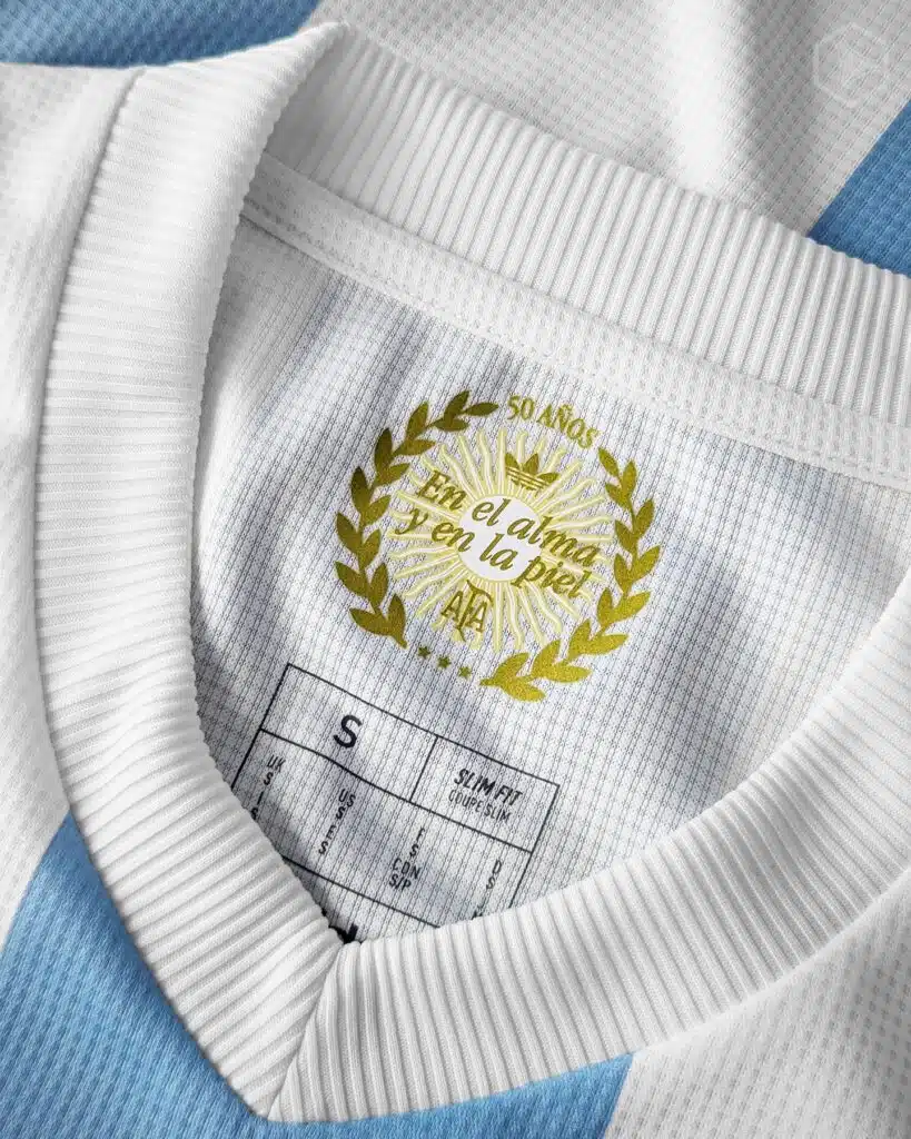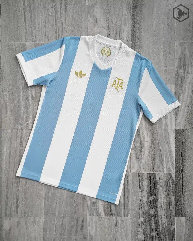 En la camiseta se pueden ver los clásicos bastones blancos y celestes, con un color claro tipo pastel como se dice actualmente y el escudo de AFA solo en su logotipo en color dorado y cercado por laureles blancos, mientras que el logo de Adidas es la versión retro también dorado.