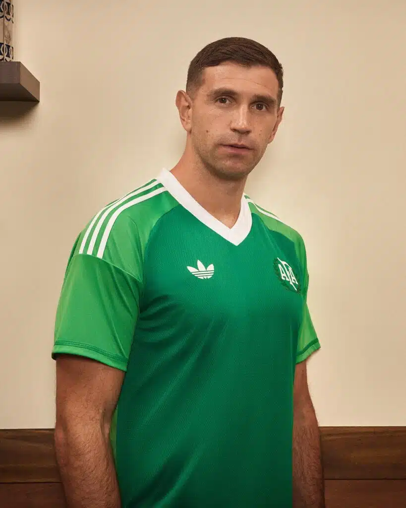 Además de presentar la titular, también presentaron la del arquero, que usará el “Dibu” Martínez que es de color verde popularizado y mucho en esa época, un color épico que a los Argentinos les trae el mejor de los recuerdos los logos de Adidas y AFA en blanco con los laureles que encierran la palabra AFA en verde oscuro, en ese mundial lo usaron Miguel Ángel Santoro y Daniel Carnevali, después ese color verde inglés seguiría con el Pato Fillol en 1978.