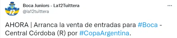 Este sábado arrancó la venta de entradas para el partido de Boca ante Central Córdoba de Rosario por Copa Argentina. El equipo de Sebastián Battaglia va a jugar el miércoles 2 de marzo, a las 21.30, en el estadio Mario Alberto Kempes, de Córdoba y, como es costumbre, los hinchas del Xeneize van a agotar rápidamente los tickets.
