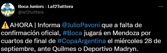 Según la información que publicó el periodista Julio Pavoni, a Boca ya le llegó una notificación oficial de cuando deberá jugar su partido. A la espera de que Quilmes y Deportivo Madryn deban jugar, el conjunto xeneize tiene fecha definida. En principio, el partido por los cuartos de final se estaría jugando el 28 de septiembre cuando se enfrenten esos conjuntos.