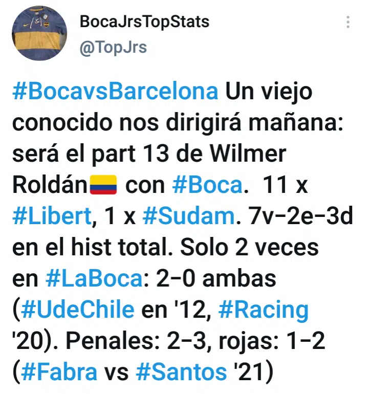 Por otro lado Roldán en dichos encuentros también cobró dos penales a favor del Xeneize y tres en contra. Además expulsó a solo un jugador de Boca en todo este tiempo, Frank Fabra, en las semifinales de la edición pasada del torneo contra Santos. Vale agregar que tras el partido de esta noche, la última fecha del equipo será ante The Strongest el miércoles 26 nuevamente en La Bombonera.