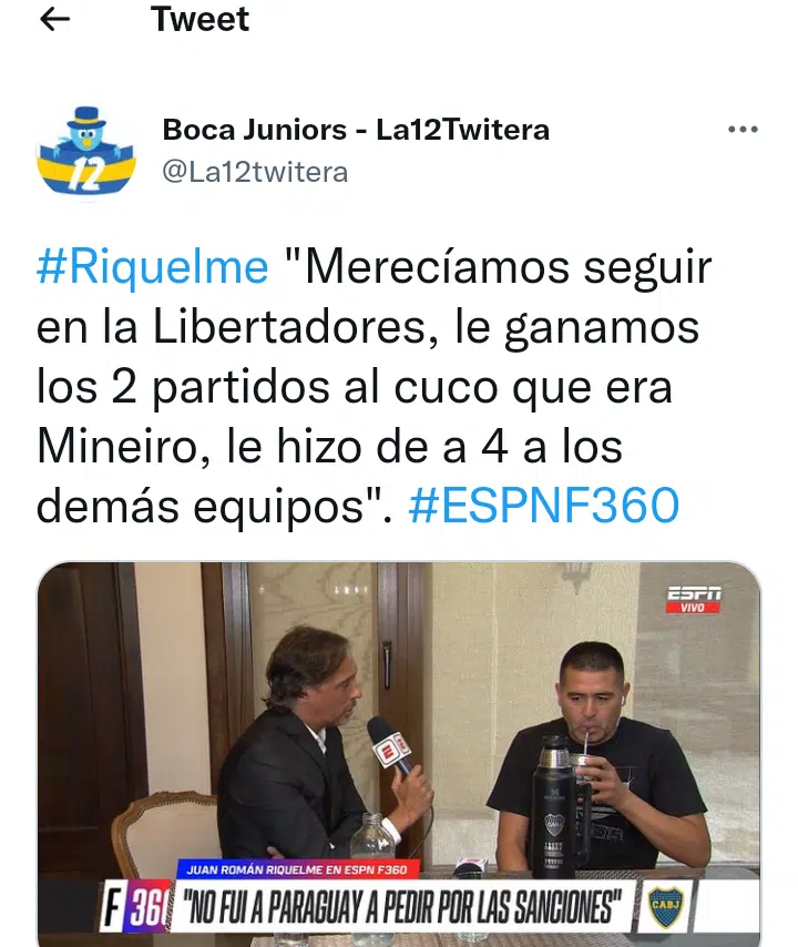 Uno de los temas centrales de la entrevista que brindó, fue la eliminación pasada en Copa Libertadores: “Merecíamos seguir, le ganamos los dos partidos al cuco que era Atlético Mineiro”. Riquelme recordó aquella serie donde a Boca lo perjudicaron en ambos partidos. Hace poco el club pidió que se rebajen las sanciones a los jugadores involucrados en los incidentes después del partido, pero eso no pasó.