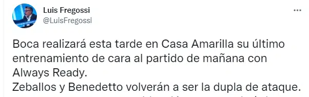Según contó Luis Fregossi, reconocido periodista del club de la Ribera, el entrenador del Xeneize se inclinaría por darle lugar a Darío Benedetto y a Exequiel Zeballos. Una dupla que ilusiona a todos los hinchas de Boca. En el entrenamiento de esta tarde, antes de partir para la concentración, Battaglia debe definir el armado del equipo.