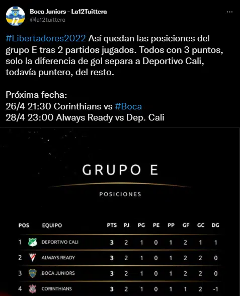 Debido a la victoria del equipo de Brasil sobre Deportivo Cali emparejó toda la zona. Por un lado, tanto Always Ready, Deportivo Cali, Boca y Corinthians reúnen todos 3 unidades. Por eso para los próximos compromisos será vital establecer la diferencia de gol. Aunque está claro que todos los resultados se dieron a favor del equipo xeneize.