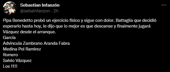 Según la información que se brindó esta mediodía el periodista Cristian Infanzón, Sebastián Battaglia decidió no incluir a Darío Benedetto. El motivo de esta decisión obedece a una molestia física. Esta mañana se realizó un ejercicio de activación en el hotel, donde el delantero manifestó alguna dolencia. Por eso mismo, el director técnico tomó esta determinación.