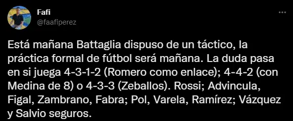 Según la información que contó el periodista Facundo Pérez de Cadena Xeneize hay 10 nombres seguros. Rossi; Advincula, Figal, Zambrano, Fabra; Pol, Varela, Ramírez; Vázquez y Salvio son los que ya tienen su lugar asegurado. Por otro lado, Cristian Medina, Óscar Romero y Exequiel Zeballos son los que pelean por un puesto en el once titular.