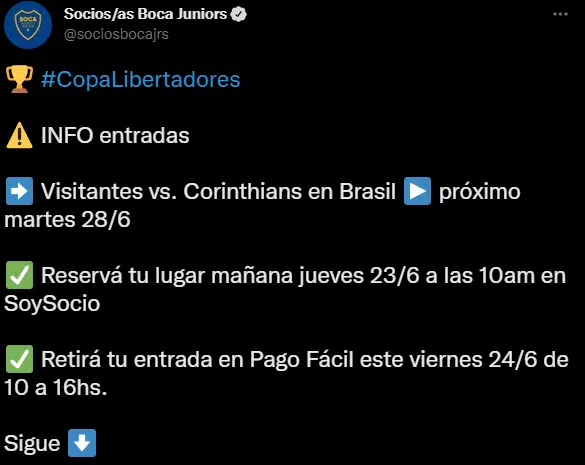 Para el encuentro de Boca ante Corinthians, estarán disponibles unas 3000 entradas. Las mismas se pusieron en venta a partir de las 10 de la mañana mediante la plataforma que tiene la institución. Aunque hoy se hace la reserva y se abona mañana en determinados lugares habilitados. Eso se hará en el día de mañana a partir de las 14 horas.