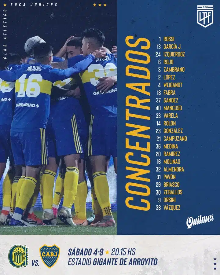 Este sábado 4 de septiembre a partir de las 20.15 hrs Boca enfrentará a Rosario Central en el Estadio Gigante de Arroyito. En el día de la fecha, el club de la Ribera compartió la lista de convocados con un importante regreso: Rossi, J. García, Izquierdoz, Rojo, Zambrano, López, Weigandt, Fabra, Sandez, Mancuso, Varela, Rolón, González, Campuzano, Medina, Ramírez, Molinas, Almendra, Pavón, Briasco, Zeballos, Orsini, Vázquez.