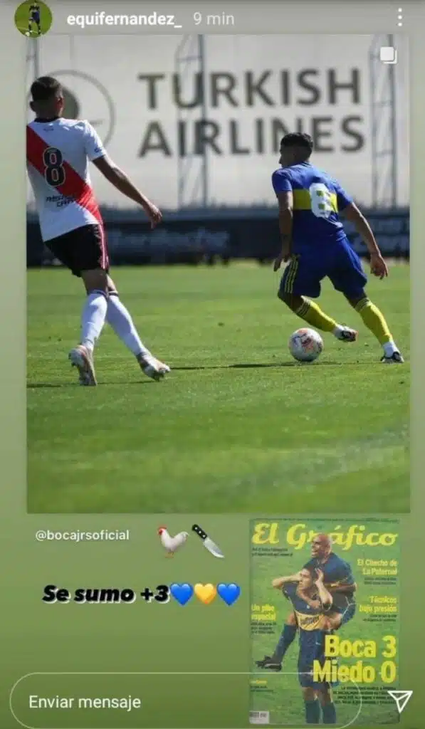 El jugador de Boca, Ezequiel Fernández, realizó un desafiante posteo luego del superclásico de reserva. Es que después de la goleada por 3-0, publicó en instagram una foto de él, y abajo una recordada tapa de Juan Román Riquelme haciendo el famoso “Topo Gigio”. Esa portada correspondía a revista El Gráfico, tras un Boca-River que el xeneize también se impuso por tres goles de diferencia.