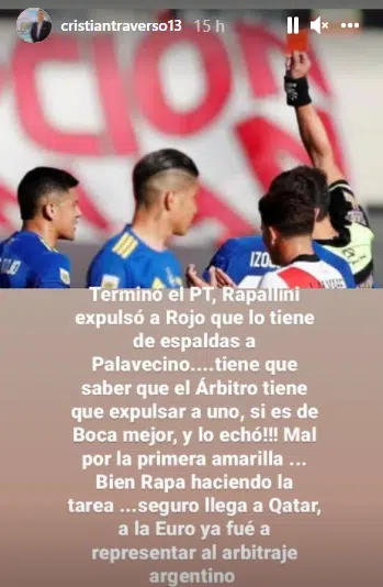 A través de una publicación en Instagram, el exfutbolista de Boca Cristian Traverso apuntó contra Rapallini por la expulsión de Rojo. “Tiene que expulsar a uno, si es de Boca mejor”, aseguró Traverso en el posteo. Allí se puede apreciar una imagen del momento en el que el árbitro le muestra la tarjeta roja al futbolista y el descargo del actual panelista de TyC Sports.