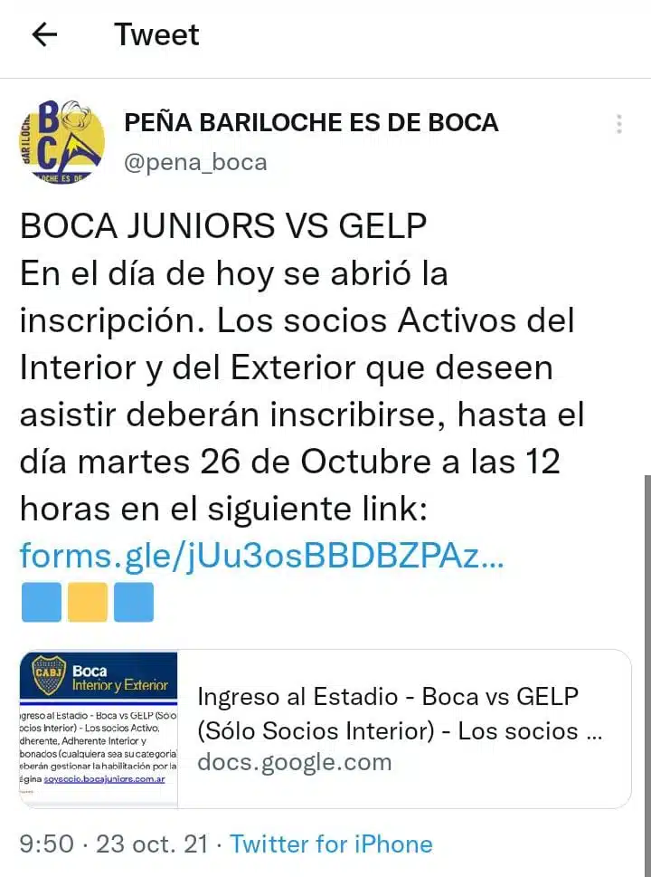 Esta información, fue brindada por la Peña de Boca ubicada en Bariloche. Son muchos los hinchas que están en el interior del país, que desean asistir a un partido del xeneize en el templo. A pesar del aforo del 50%, algunos tendrán la posibilidad de poder estar la fecha que viene, ante Gimnasia y Esgrima La Plata. Son 30 mil hinchas habilitados que tiene el conjunto azul y oro.