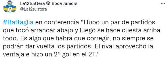 Battaglia también hizo hincapié en que el equipo otra vez empezó perdiendo (como ante Lanús y Godoy Cruz, por ejemplo) con la diferencia que en esta oportunidad no pudo darlo vuelta. “Hubo un par de partidos en donde nos tocó arrancar perdiendo y después se hace cuesta arriba. Eso es algo que hay que corregir porque no siempre se pueden dar vuelta los partidos. El domingo nos pasó eso”.