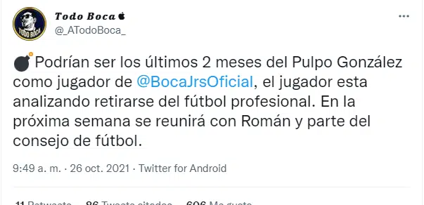 En las ultimas horas surgió el rumor de que Diego González está analizando dejar el fútbol cuando finalice su contrato con Boca. Al mediocampista le quedan dos meses de contrato con el club Xeneize y en las próximas semanas se reunirá a hablar con Juan Román Riquelme y con parte del Consejo de Fútbol para analizar su situación.