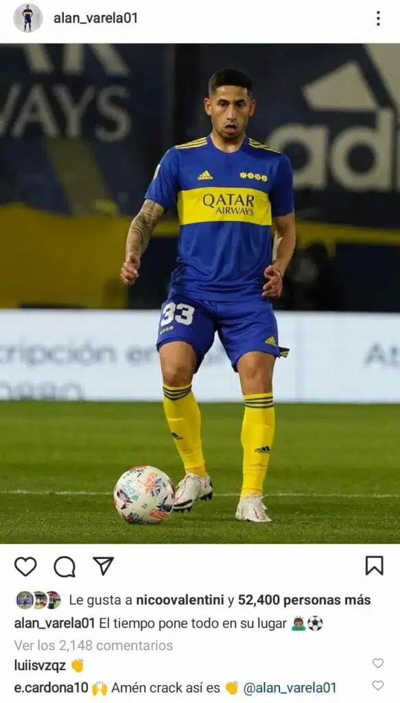 El jugador de Boca, Alan Varela publicó un llamativo mensaje en la jornada de ayer. En su red social instagram, subió una foto jugando en la Bombonera. El título decía: “El tiempo pone todo en su lugar”. Recordemos que el mediocampista no ha tenido la posibilidad en los últimos encuentros y lanzó un aviso hacia el cuerpo técnico. El posteo fue comentado por un exjugador de la institución como Ever Banega: “Exacto, usted juegue animal”.