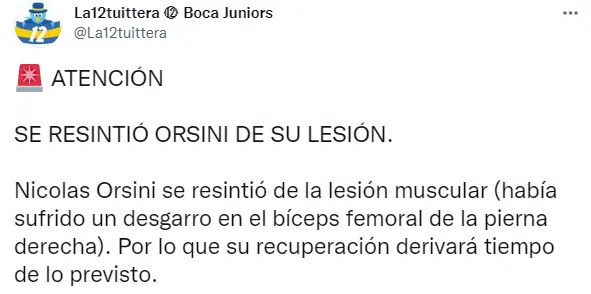 La intención de Sebastián Battaglia era sumarlo al grupo a partir de la próxima semana, pensando en el encuentro ante Sarmiento, pero esta molestia modificó los planes de cara a lo que viene. Por lo tanto, la posicion de centrodelantero seguirá siendo ocupada por Luis Vázquez y ahora solo será cuestión de tiempo para volver a ver a Orsini otra vez vestido de azul y oro.