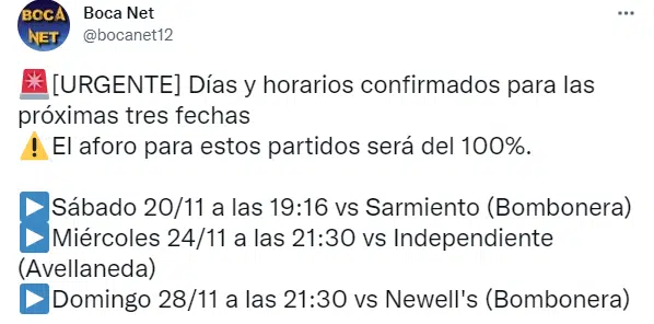 En el Xeneize, ya saben cuándo jugarían los próximos tres partidos por Liga Profesional. Tras el parate por las elecciones, Boca volvería a jugar el sábado 20 de noviembre, como local de Sarmiento. Cuatro días más tarde, el miércoles 24 sería el clásico contra Independiente en Avellaneda y la seguidilla se cerraría el domingo contra Newell’s, en la Bombonera.