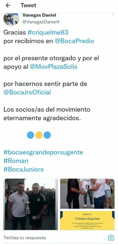 En el día de ayer, el Movimiento Plaza Solís visitó el predio de Boca Juniors. En ese momento, Juan Román Riquelme a través de su hermano, se tomó un momento para saludarlos y firmar autógrafos. En su cuenta de Twitter así lo expresaron: “Gracias criquelme83 por recibirnos en @BocaPredio por el presente otorgado y por el apoyo al @MovPlazaSolis por hacernos sentir parte de @BocaJrsOficial Los socios/as del movimiento eternamente agradecidos“.