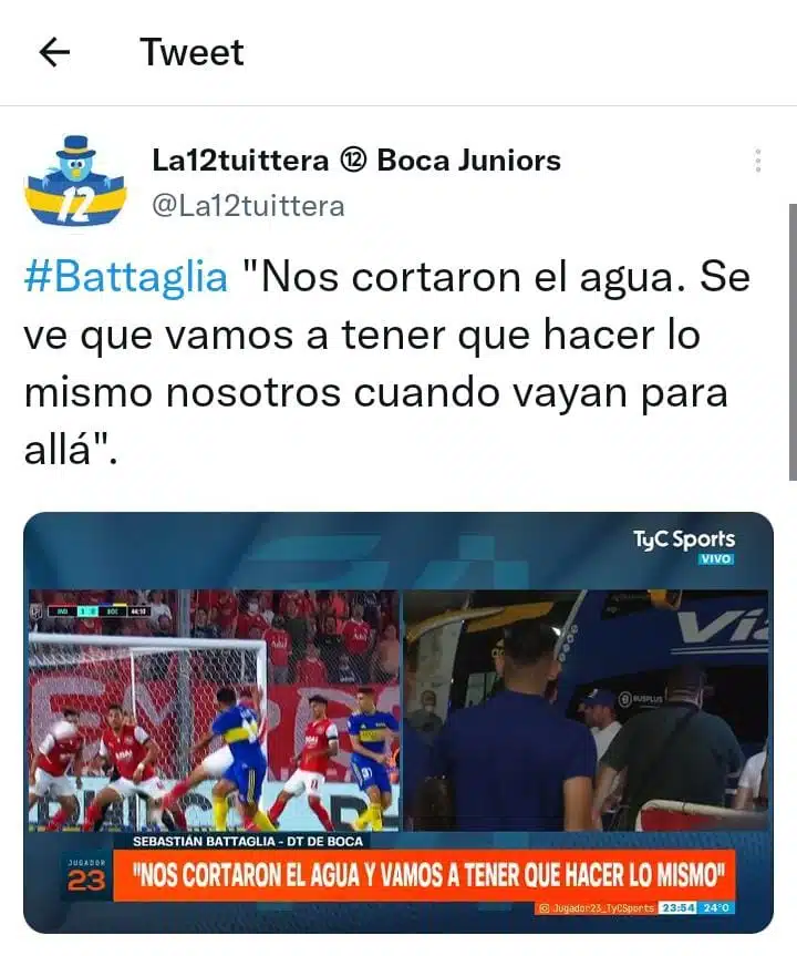 Tras la derrota 1-0 ante Independiente, ocurrió algo increíble en el estadio Libertadores de América. Los jugadores de Boca fueron al vestuario pero les cortaron el agua, por lo que no pudieron bañarse. En ese sentido, Sebastián Battaglia afirmó: “Nos cortaron el agua. Vamos a tener que hacer lo mismo cuando vayan para allá”. El partido terminó muy caliente y eso fue la gota que rebalsó el vaso.