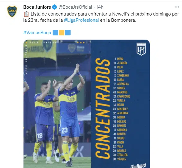 Boca enfrentará este domingo a Newell’s por la fecha 23 de la Liga Profesional y Sebastián Battaglia dio a conocer la lista de concentrados para jugar a las 21.30 en la Bombonera. La nómina está conformada por 25 jugadores y cuenta con una ausencia importante y dos regresos respecto a los citados para el encuentro del miércoles pasado frente a Independiente.