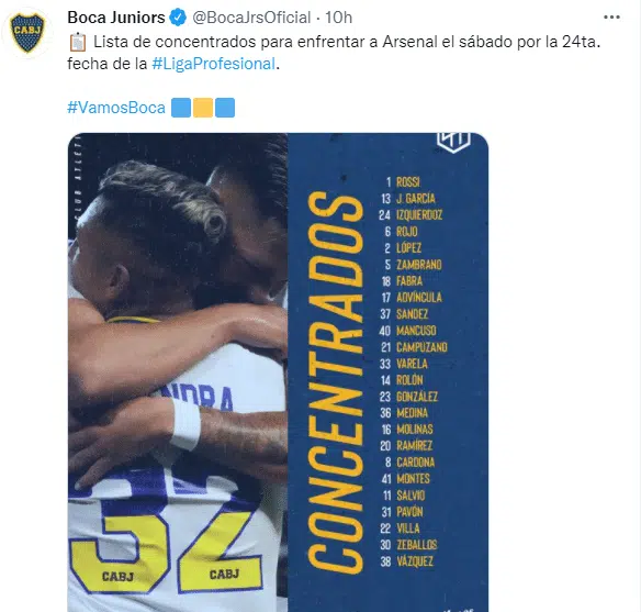 Boca entregó e hizo publica la lista de concentrados para el partido del sábado ante Arsenal por la fecha 24 de la Liga Profesional. En tanto, Agustín Almendra pidió concentrar aunque Sebastián Battaglia no lo podrá tener a consideración debido a que llegó ante Newell´s a la quinta amarilla y está suspendido. El regreso importante es el de Carlos Izquierdoz, quien ya cumplió su sanción.