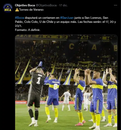 Boca esta de vacaciones luego de un año que fue bastante extenso en cuanto a la competencia. Pero el equipo de Battaglia ya tiene confirmado los rivales en los amistosos de la pretemporada. Lo único concreto es que disputará un amistoso en San Juan ante San Lorenzo, San Pablo, Colo Colo y Universidad de Chile. Aunque todavía falta un rival.