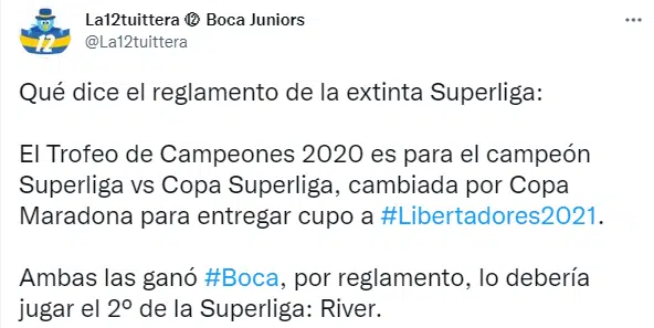 Pero la otra parte y la más importante del reglamento de La Liga sobre el Trofeo de Campeones, despeja todas las dudas e indica quien debe ser el rival del equipo de la Ribera: “En caso de repetirse el campeón en ambas competencias, el equipo que la disputara será el subcampeón del Campeonato de Primera División de la Superliga 2019/2020“.