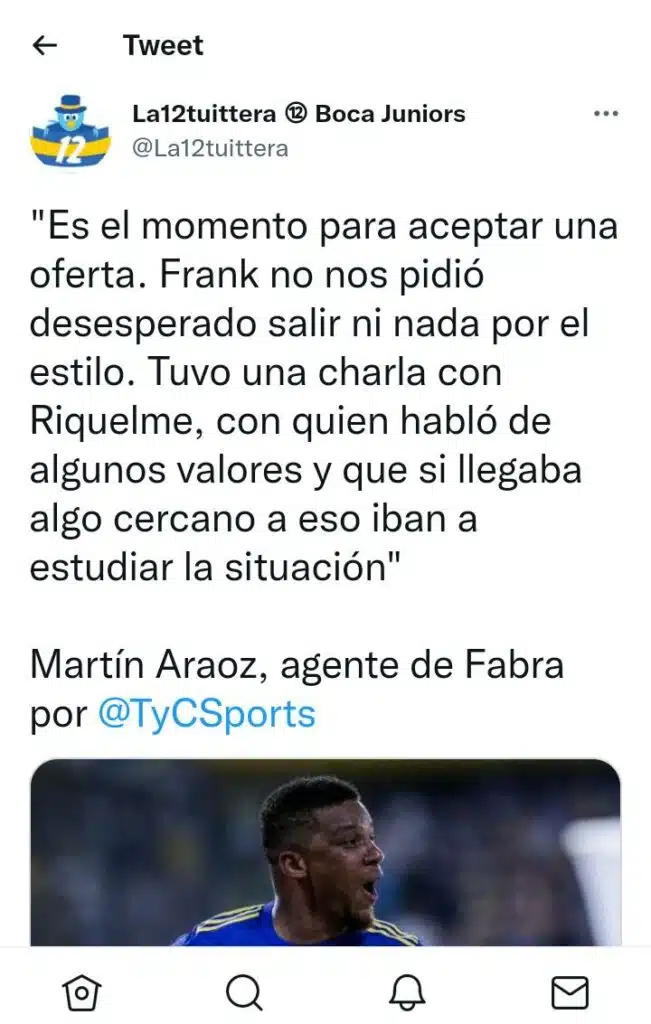 También sostiene Martín Araoz: “Frank no nos pidió de manera desesperada salir ni nada, pero es el momento de escuchar ofertas”. En esa charla que hubo entre Fabra y Riquelme, se habló de los valores que el jugador busca o espera de un equipo, si algo muy cercano a eso llega al club se va a estudiar la situación. Hasta el momento, no se conoció alguna oferta por el colombiano.