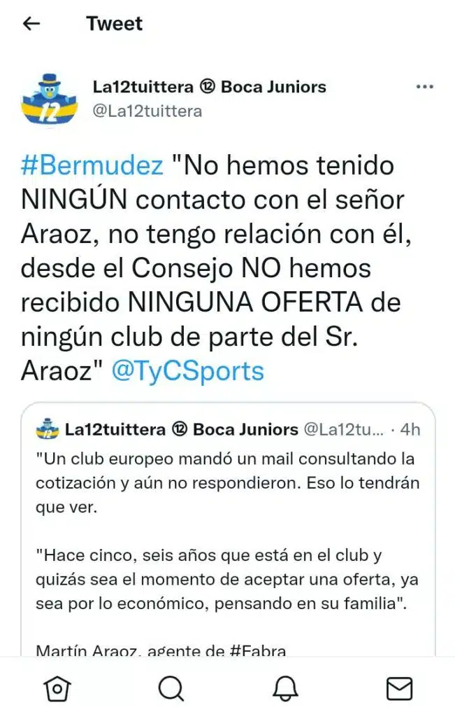 Con respecto a esto, Bermúdez aclaró: “No hemos recibido ninguna oferta de ningún club de parte del señor Aráoz”. Este ida y vuelta solo confunde mas las cosas. A todas las novelas que tiene Boca en este mercado de pases, también se le a sumar la de Fabra. Casi como una sorpresa que se conozca las intenciones que tiene el colombiano de cambiar de aire.