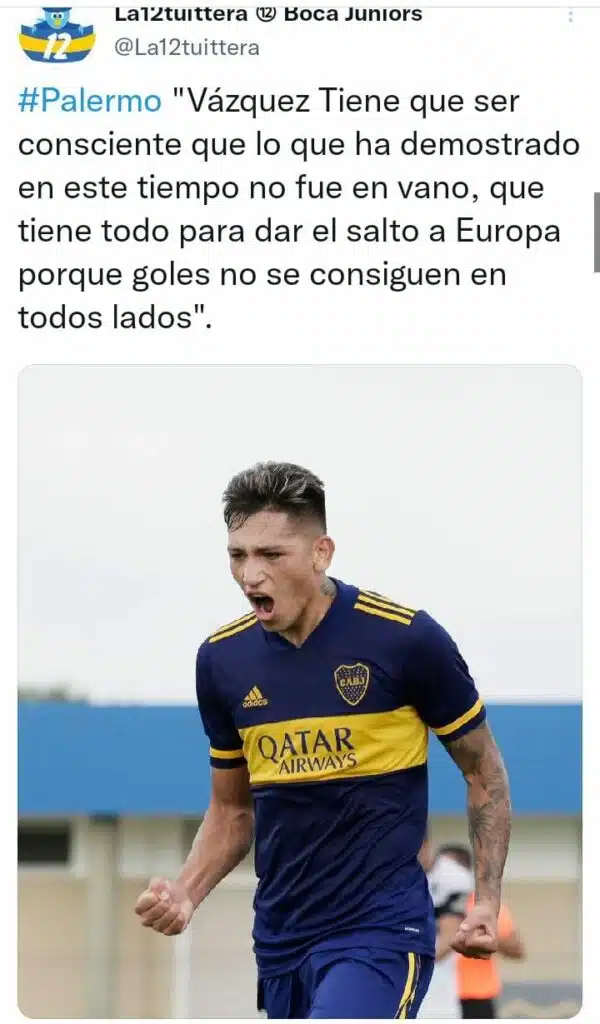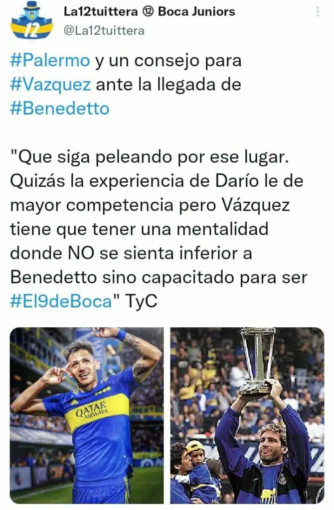 Además, agregó: “Que siga peleando por ese lugar. Quizás la experiencia de Darío le de mayor competencia. Pero Vázquez tiene que tener una mentalidad donde no se sienta inferior a Benedetto sino capacitado para ser el 9 de Boca”. A pesar de ello, hoy Sebastián Battaglia puso a Nicolás Orsini como delantero titular en la práctica del primer equipo. Habrá una buena competencia interna en el ataque bostero.